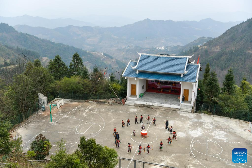 Students practice traditional dance of Yao ethnic group at the Zhongzhai education spot in Xishan Town of Congjiang County, Qiandongnan Miao and Dong Autonomous Prefecture, southwest China's Guizhou Province, Feb. 16, 2023. Zhongzhai education spot, located in the remote mountainous area of Guizhou Province, has only one teacher and 16 students of Yao ethnic group. In recent years, the conditions of this "mini primary school" have been greatly improved with the help of local government and community. (Photo by Long Mengqian/Xinhua)