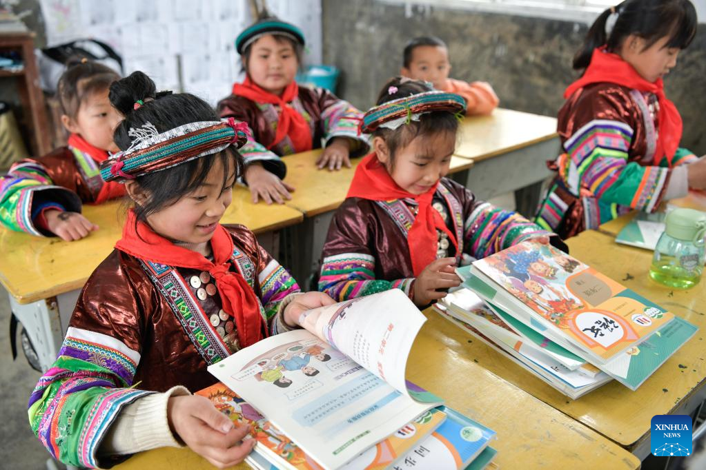 Students receive new books at the Zhongzhai education spot in Xishan Town of Congjiang County, Qiandongnan Miao and Dong Autonomous Prefecture, southwest China's Guizhou Province, Feb. 16, 2023. Zhongzhai education spot, located in the remote mountainous area of Guizhou Province, has only one teacher and 16 students of Yao ethnic group. In recent years, the conditions of this "mini primary school" have been greatly improved with the help of local government and community. (Xinhua/Yang Wenbin)