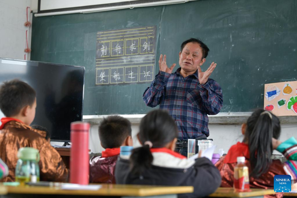 Teacher Meng Rongda gives a lesson at the Zhongzhai education spot in Xishan Town of Congjiang County, Qiandongnan Miao and Dong Autonomous Prefecture, southwest China's Guizhou Province, Feb. 16, 2023. Zhongzhai education spot, located in the remote mountainous area of Guizhou Province, has only one teacher and 16 students of Yao ethnic group. In recent years, the conditions of this "mini primary school" have been greatly improved with the help of local government and community. (Xinhua/Yang Wenbin)