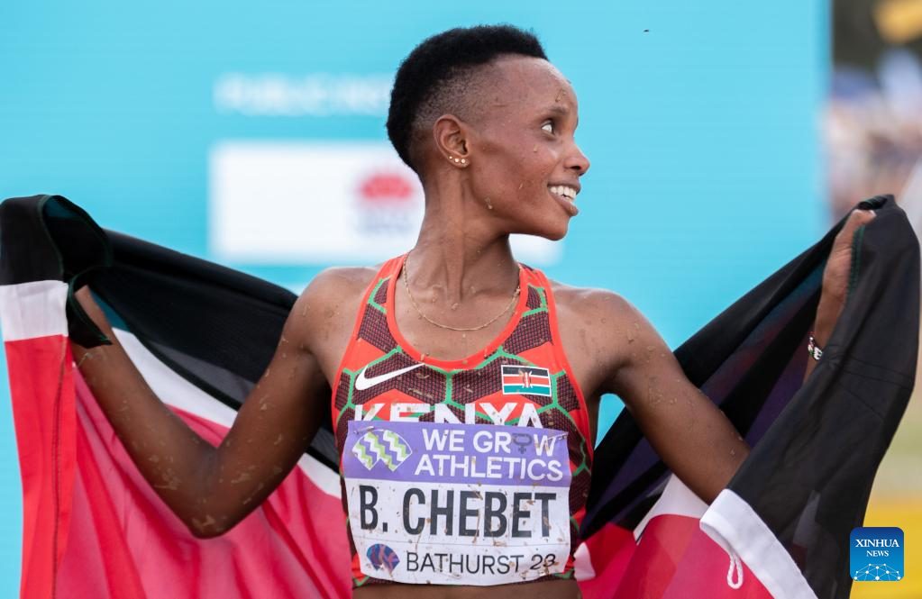 Beatrice Chebet of Kenya crosses the finishing line during the women's 10km race at the World Athletics Cross Country Championships Bathurst 23 in Bathurst, New South Wales, Australia, on Feb. 18, 2023. (Photo by Hu Jingchen/Xinhua)