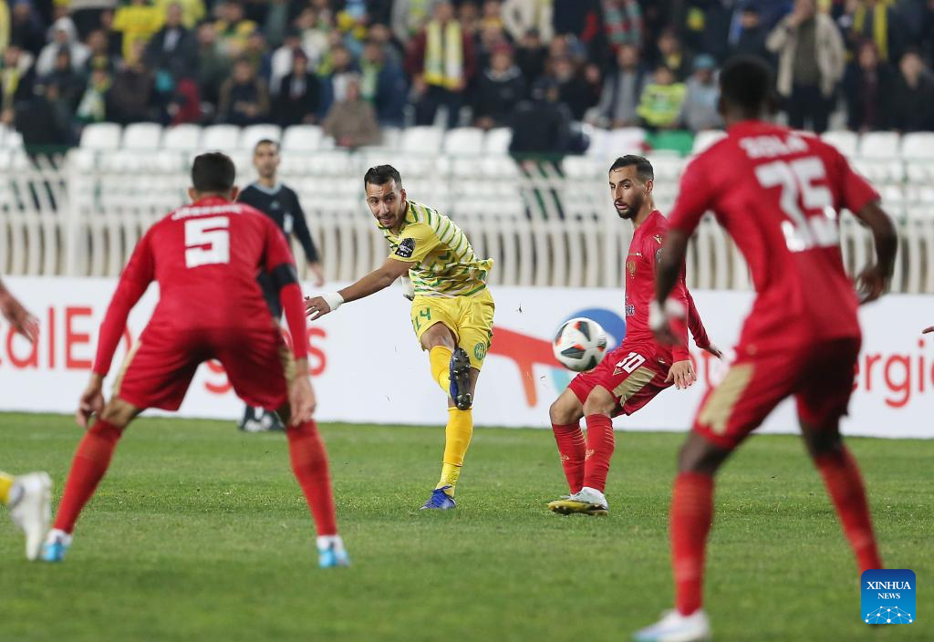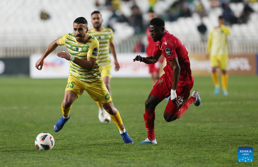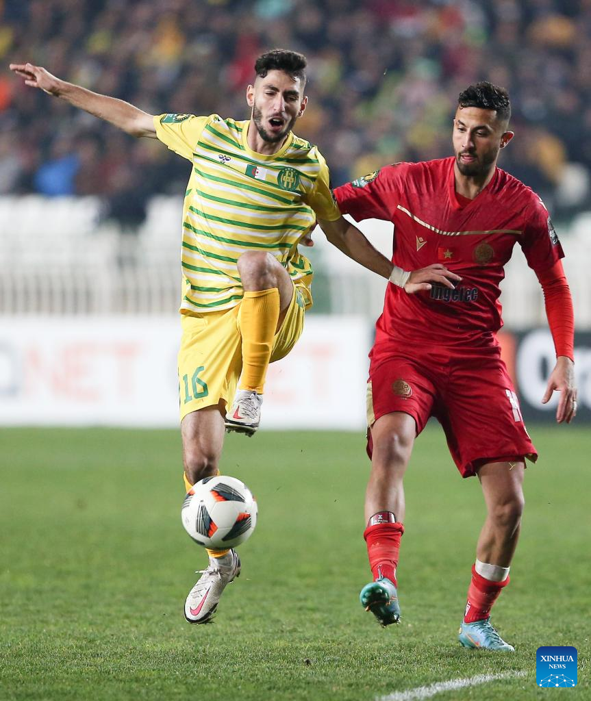 JS Kabylie's Bedr Eddine Souyad (2nd R) competes during the CAF Champions League 2023 football match between JS Kabylie of Algeria and Wydad Casablanca of Morocco in Algiers, Algeria, Feb. 17, 2023. (Xinhua)