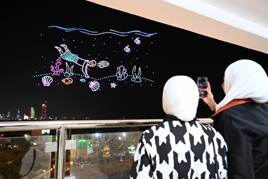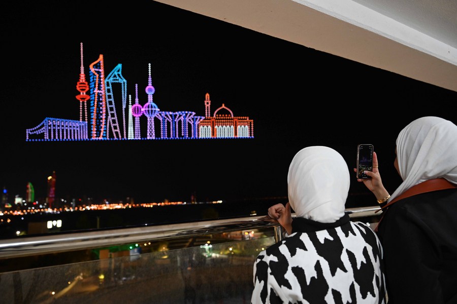 People watch a drone light show as part of the celebrations of Kuwait's National Day and Liberation Day in Kuwait City, Kuwait, Feb. 16, 2023. (Photo by Asad/Xinhua)