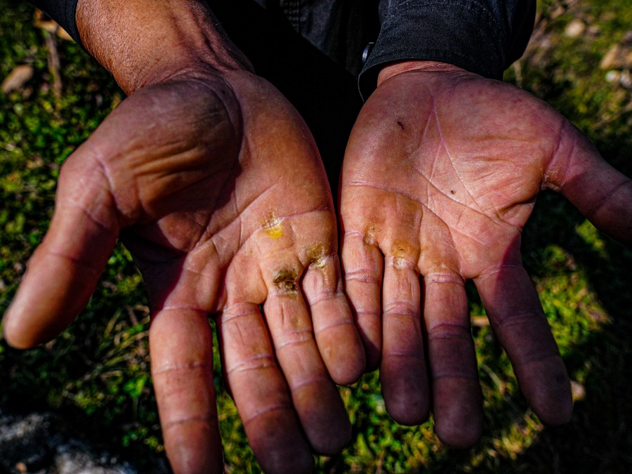 A forest police officer with the Hongtupo forest police station demonstrates his palms in Nanhua County, Chuxiong Yi Autonomous Prefecture, southwest China's Yunnan Province, Feb. 8, 2023. (Photo by Hou Weijing/Xinhua)