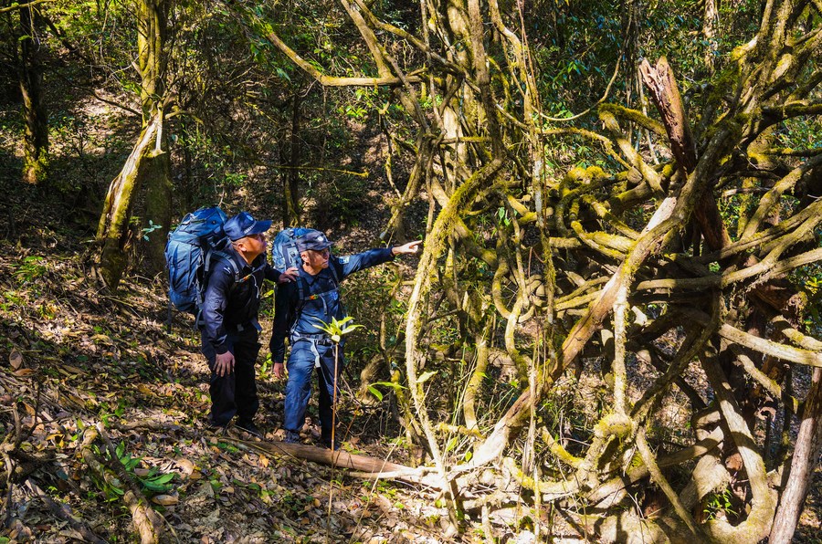 Forest police officers with the Hongtupo forest police station check the growth of trees in Dazhong Mountain, Chuxiong Yi Autonomous Prefecture, southwest China's Yunnan Province, Feb. 8, 2023. (Photo by Hou Weijing/Xinhua)
