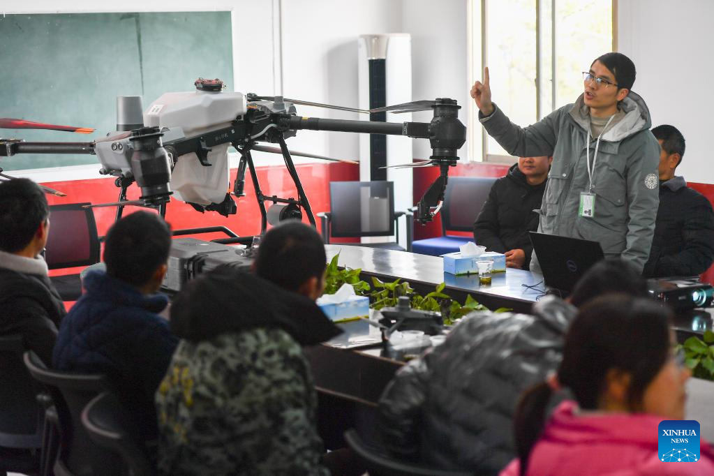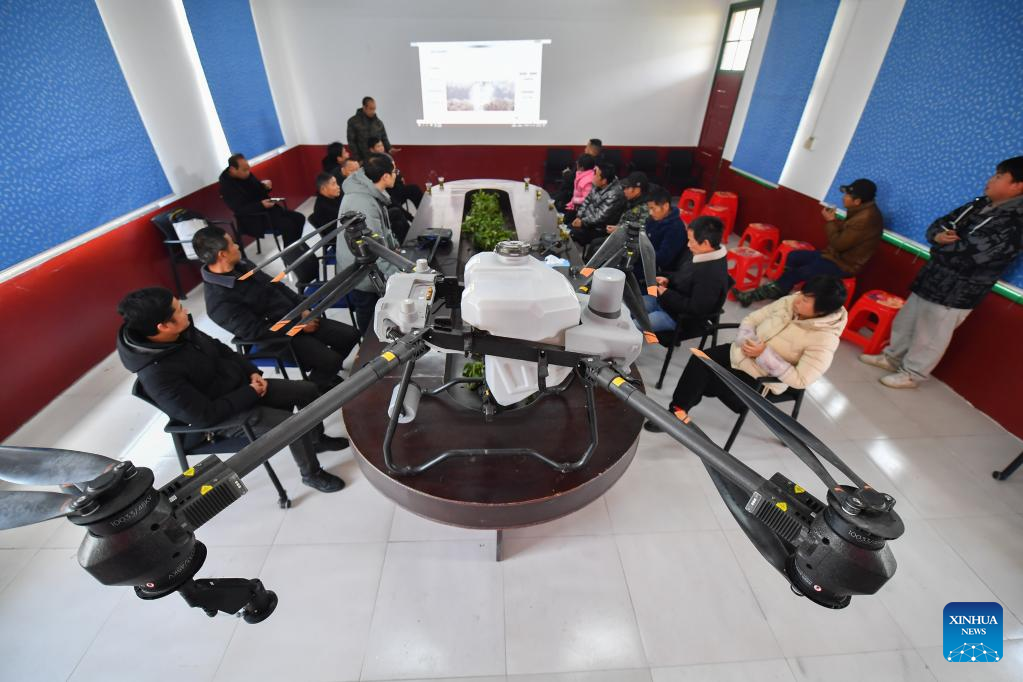 A tutor demonstrates the structure of a drone in Fu'an Village of Gonghua Town in Yuanjiang, central China's Hunan Province, Feb. 15, 2023. Fu'an Village conducted a drone operation training on Wednesday for local villagers to prepare for the spring ploughing. (Xinhua/Chen Zeguo)