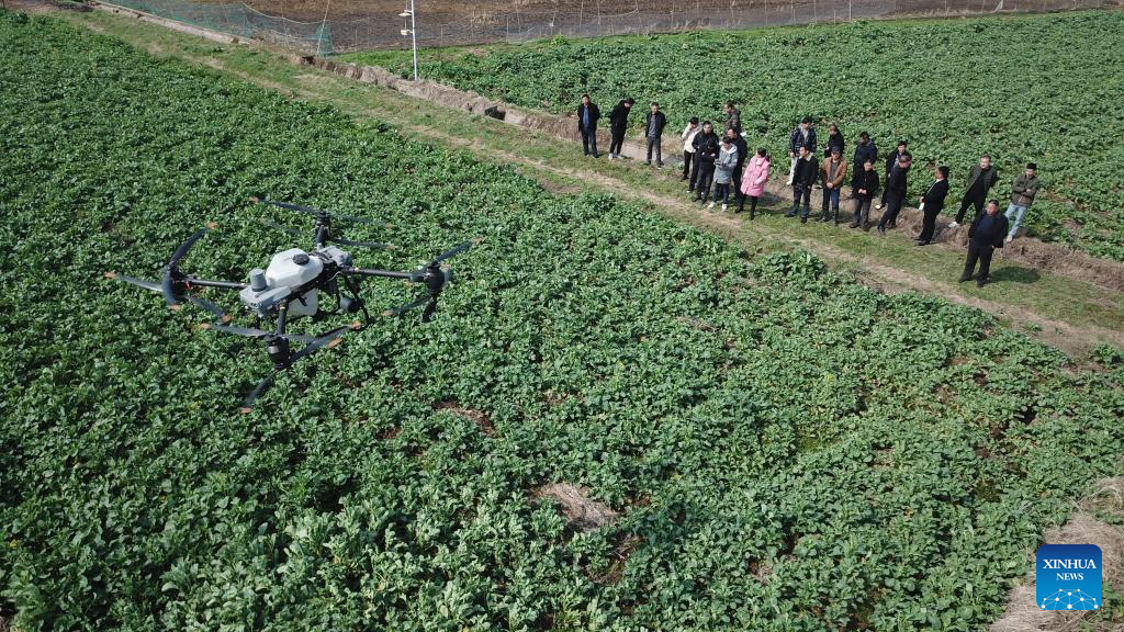 Trainees watch a drone takeoff demonstration in the field in Fu'an Village of Gonghua Town in Yuanjiang, central China's Hunan Province, Feb. 15, 2023. Fu'an Village conducted a drone operation training on Wednesday for local villagers to prepare for the spring ploughing. (Xinhua/Chen Zeguo)