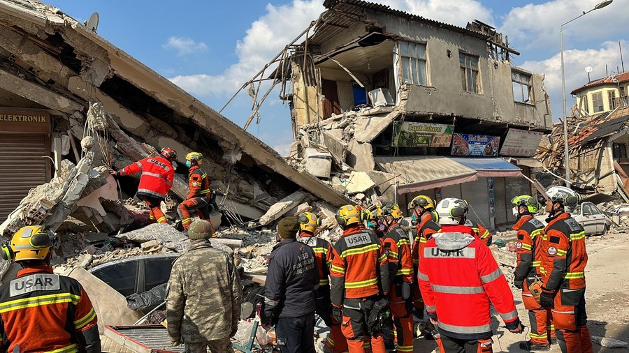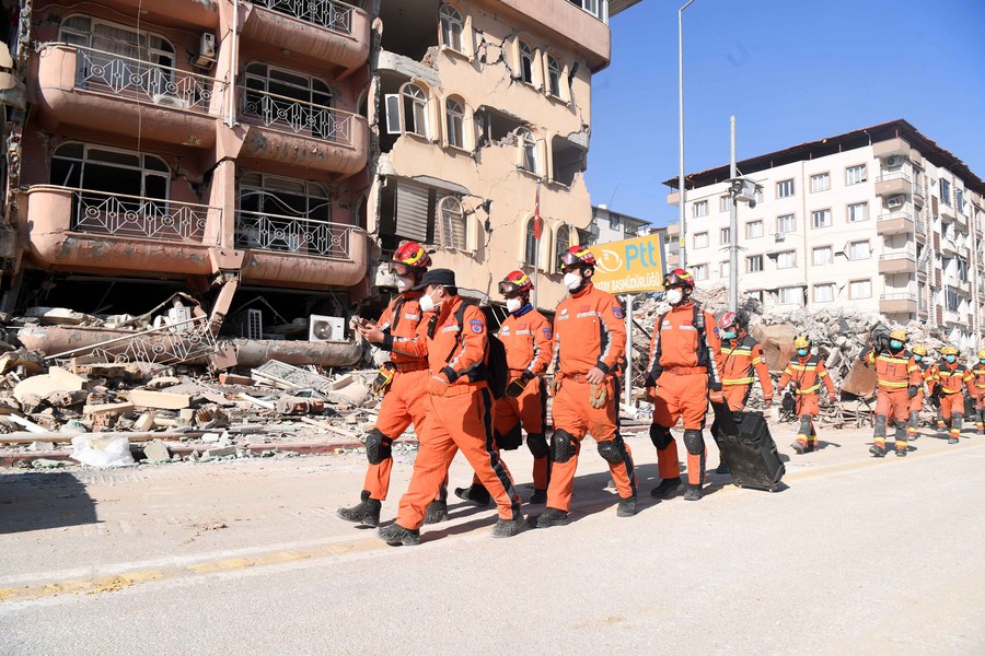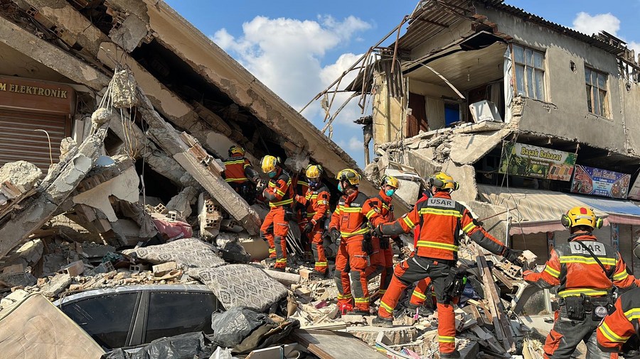 A joint rescue group encompassing members of China Search and Rescue Team and a search and rescue team from the Hong Kong Special Administrative Region (HKSAR) carry out rescue operation among earthquake debris in Antakya, southern province of Hatay, Türkiye, Feb. 14, 2023. (Xinhua/Shadati)