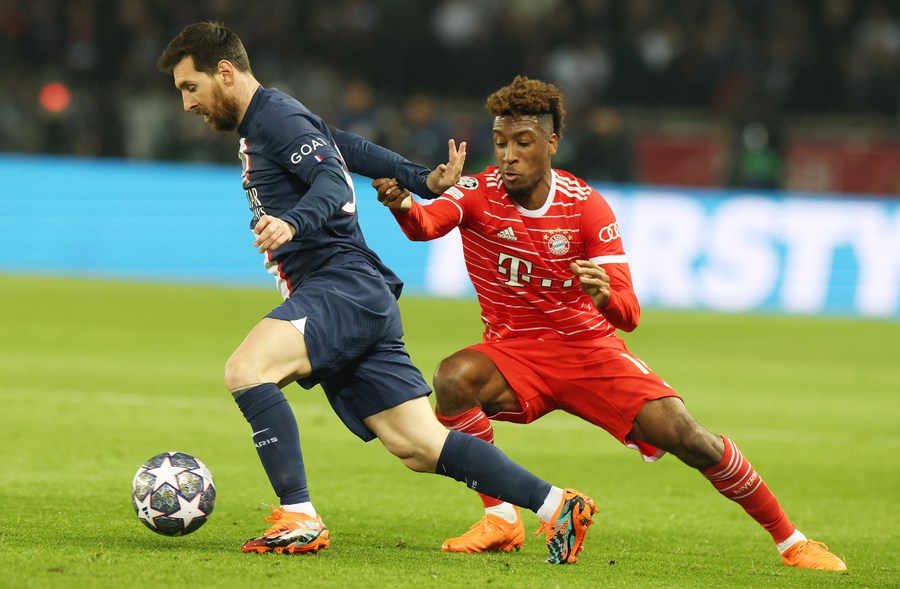 Paris Saint-Germain's Lionel Messi (L) vies with Bayern Munich's Kingsley Coman during their first leg of their UEFA Champions League round of 16 tie at the Parc des Princes in Paris on Feb. 14, 2023. (Xinhua/Gao Jing)