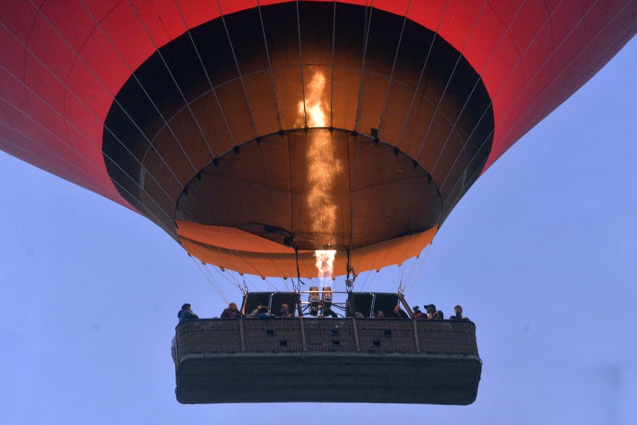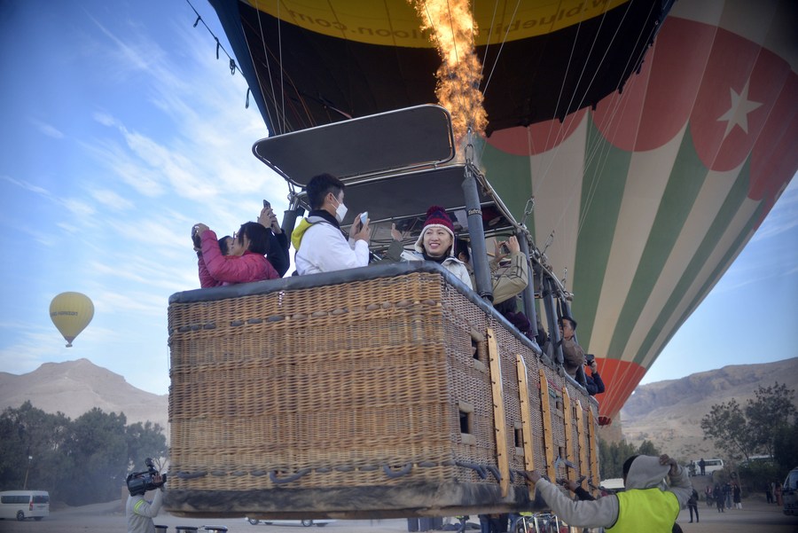 Tourists take a hot air balloon on the west bank of Nile River in Luxor, Egypt, on Feb. 17, 2023. (Photo by Radwan Abu Elmagd/Xinhua)