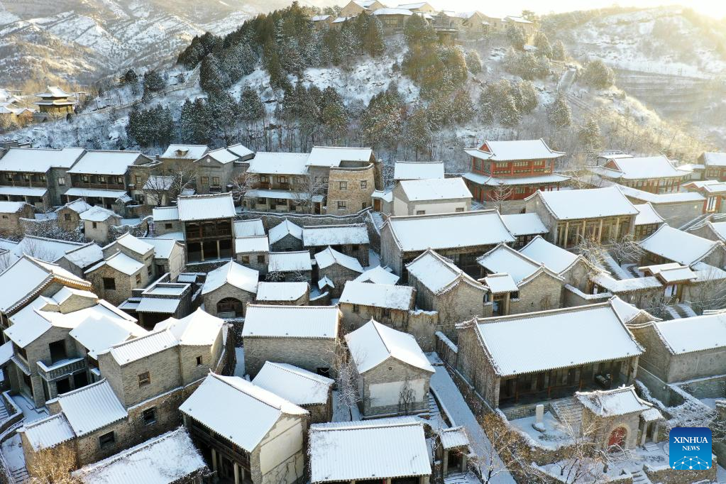 This aerial photo taken on Feb. 19, 2023 shows snow scenery of the Gubei Water Town in Beijing, capital of China. (Xinhua/Chen Yehua)
