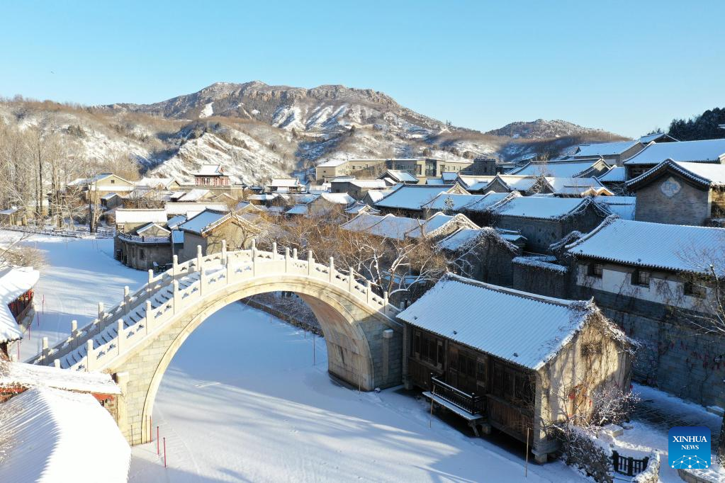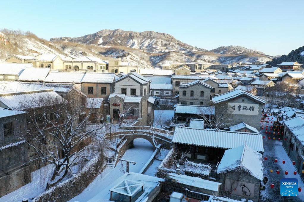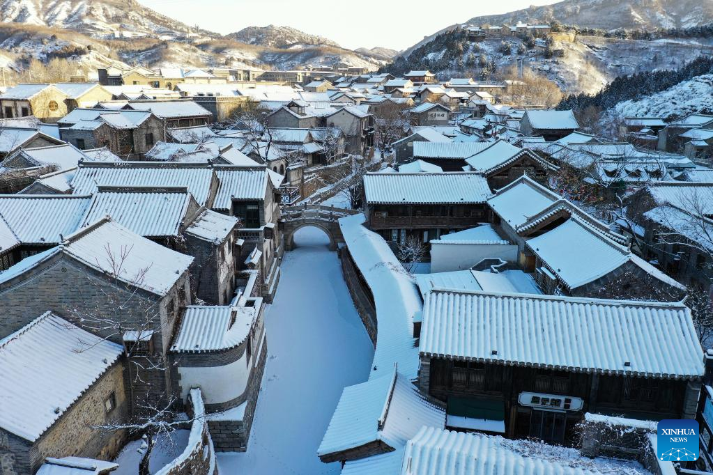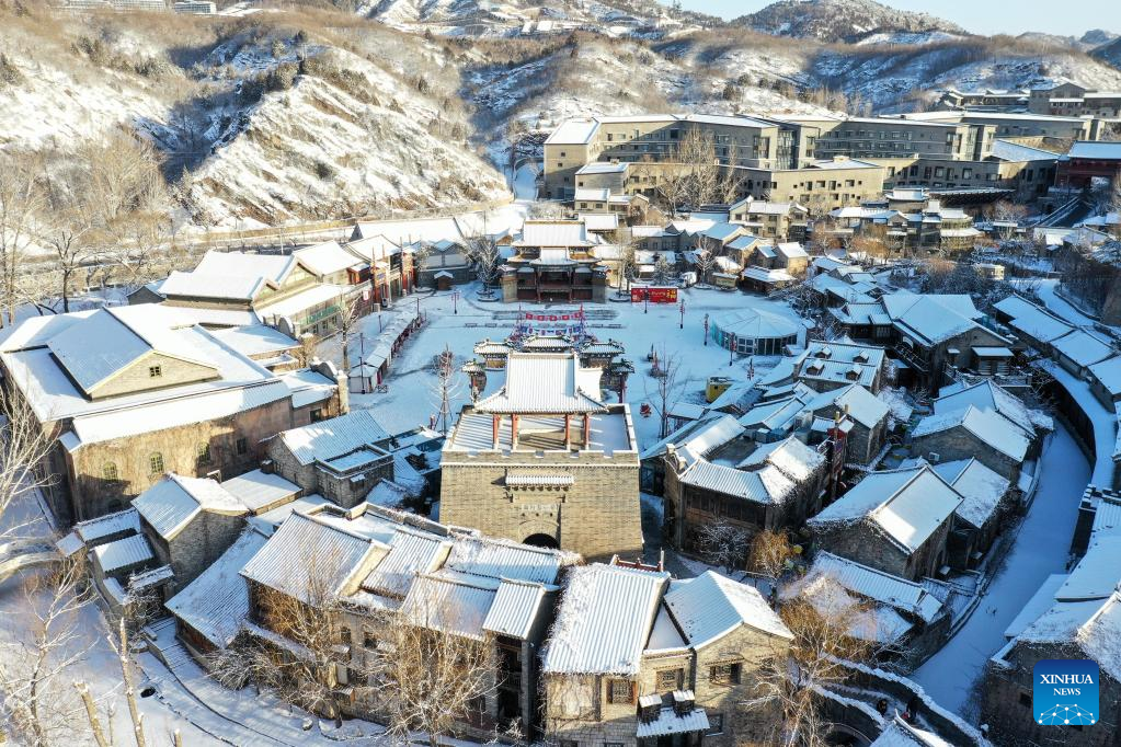 This aerial photo taken on Feb. 19, 2023 shows snow scenery of the Gubei Water Town in Beijing, capital of China. (Xinhua/Cai Yang)
