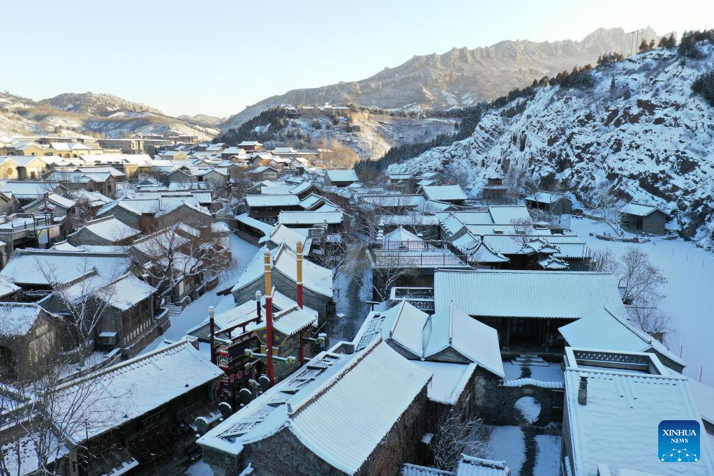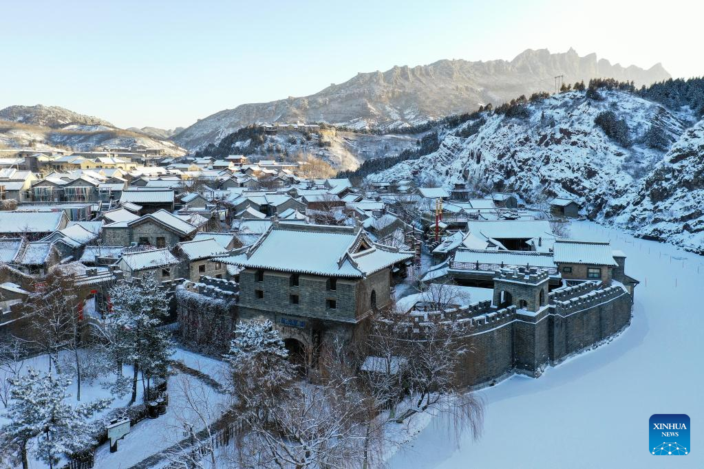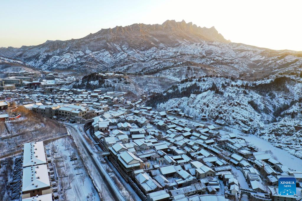 This aerial photo taken on Feb. 19, 2023 shows snow scenery of the Gubei Water Town with the Simatai section of the Great Wall in the background at sunrise in Beijing, capital of China. (Xinhua/Chen Yehua)