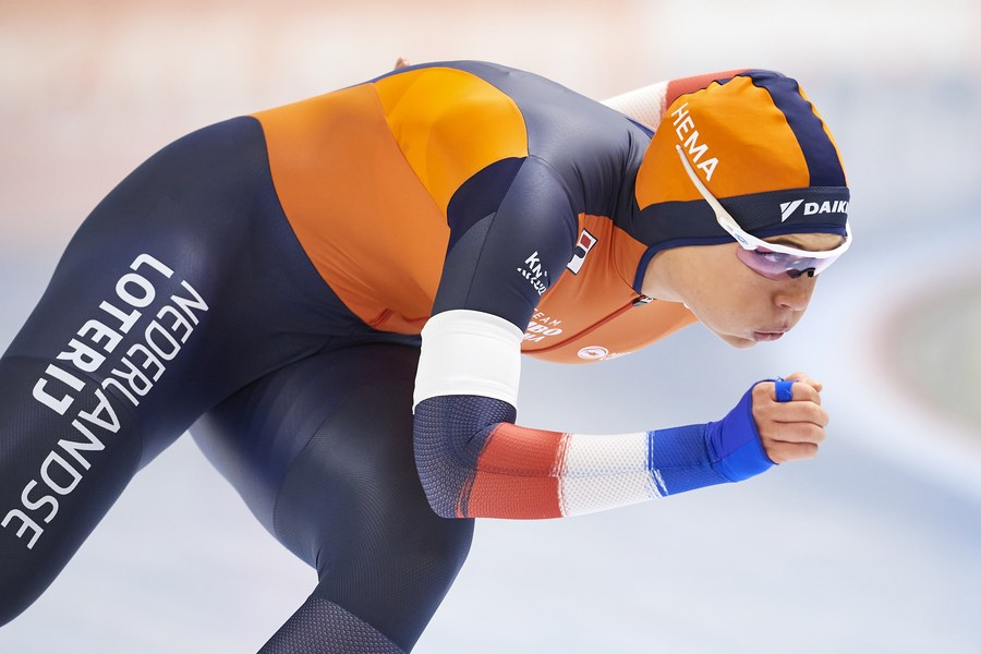 Jutta Leerdam of the Netherlands competes in the women's 1000m Division A race at the ISU Speed Skating World Cup in Tomaszow Mazowiecki, Poland on Feb. 19, 2023. (Photo by Rafal Oleksiewicz/Xinhua)