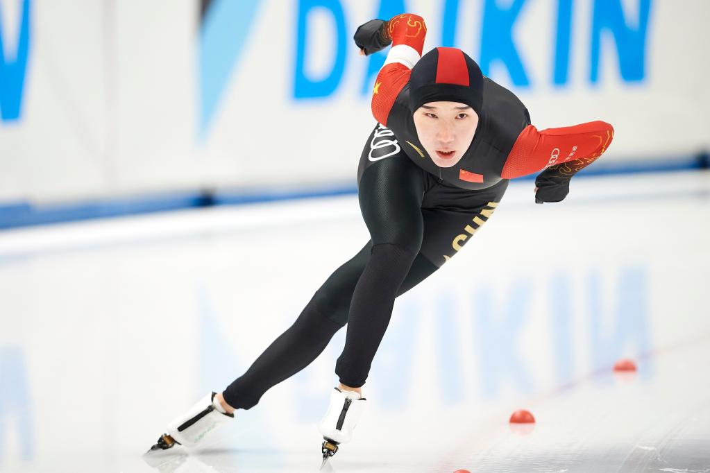 Han Mei of China competes in the women's 1000m Division A race at the ISU Speed Skating World Cup in Tomaszow Mazowiecki, Poland on Feb. 19, 2023. (Photo by Rafal Oleksiewicz/Xinhua)