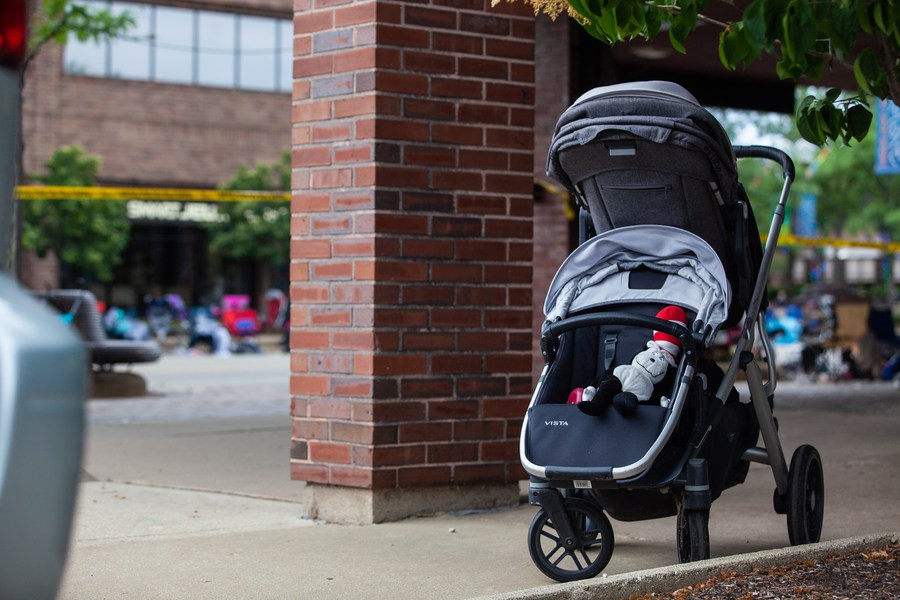 An empty stroller is left behind at the scene of a mass shooting in Highland Park, Illinois, the United States, July 4, 2022. (Photo by Vincent Johnson/Xinhua)