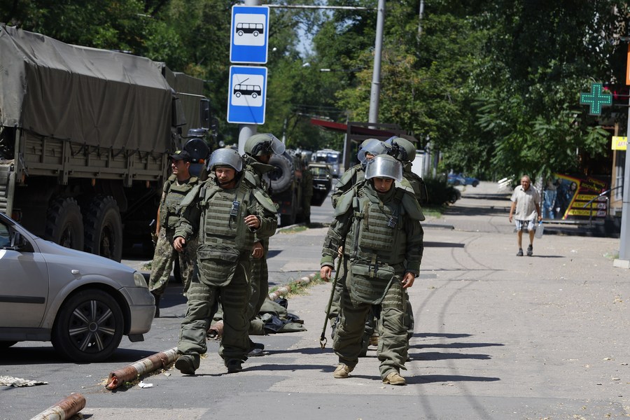 Soldiers are seen during a demining operation on a street in Donetsk, July 31, 2022. (Photo by Victor/Xinhua)