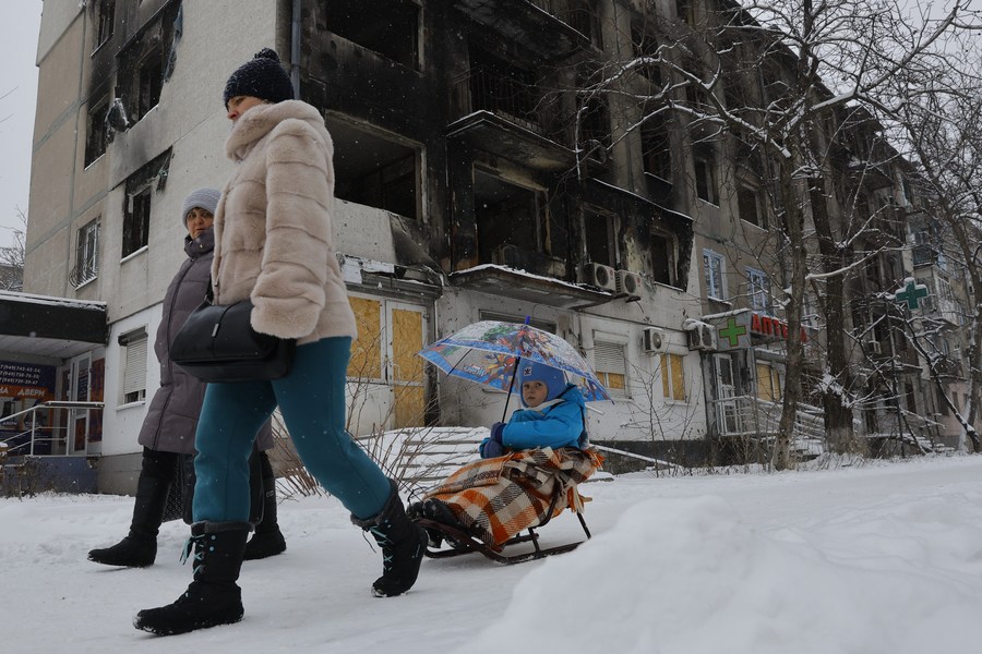 People walk past a damaged building in Mariupol, Feb. 18, 2023. (Photo by Victor/Xinhua)