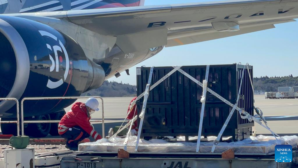 The Japan-born giant panda Xiang Xiang is about to be transferred to an airplane in Tokyo, Japan, Feb. 21, 2023. (SF Airlines/Handout via Xinhua)