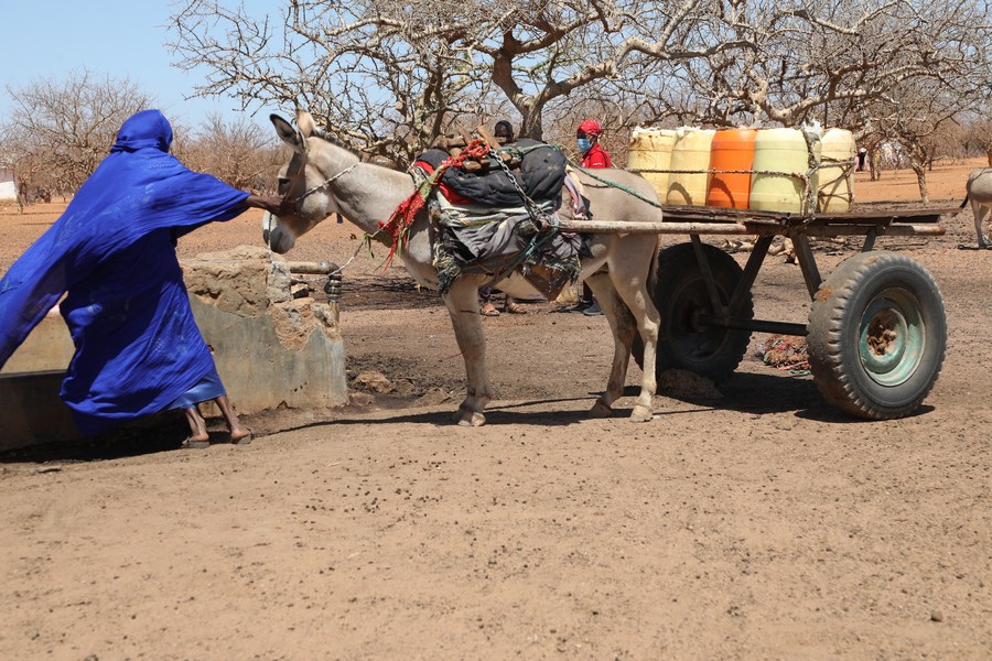 The file photo shows a woman pulling a donkey after fetching water at a borehole 25 kilometers from her home in Dertu, Garissa County, Kenya, on Nov. 10, 2021. (Photo by Stephen Ingati/Xinhua)