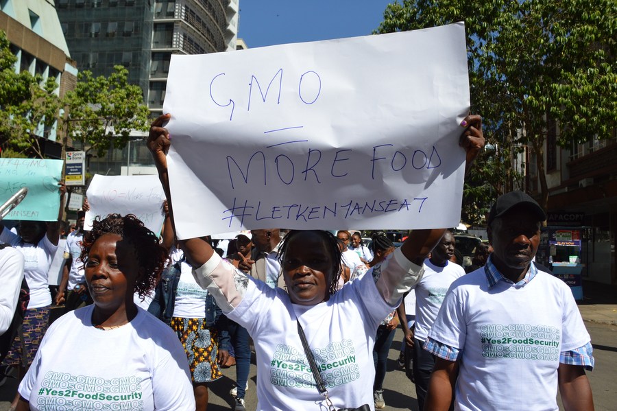 The file photo shows a resident holding a placard during a match in support of genetically modified organism (GMO) foods in Nairobi, Kenya, on Feb. 10, 2023. (Photo by Charles Onyango/Xinhua)