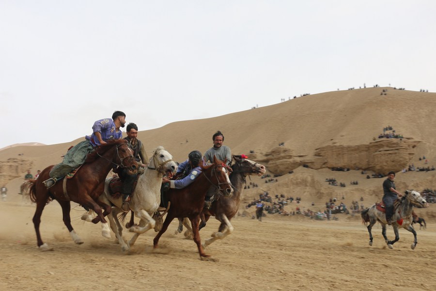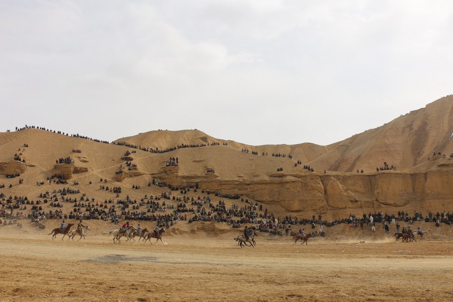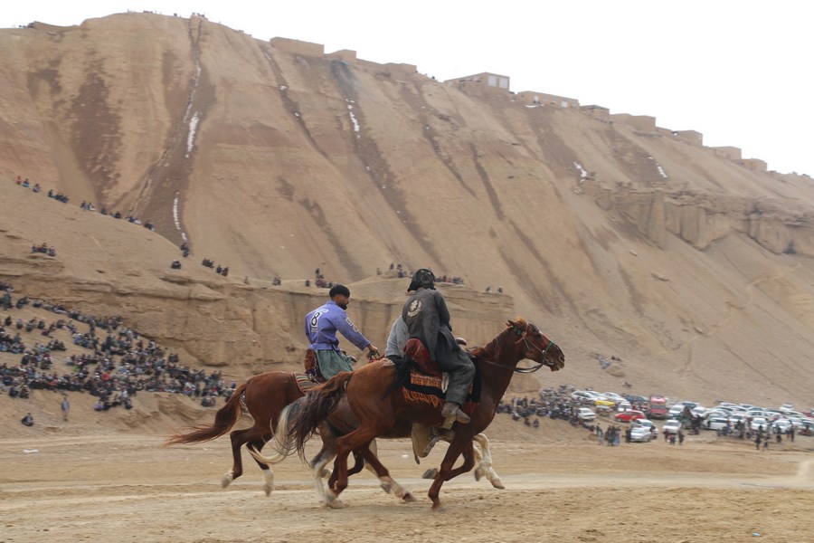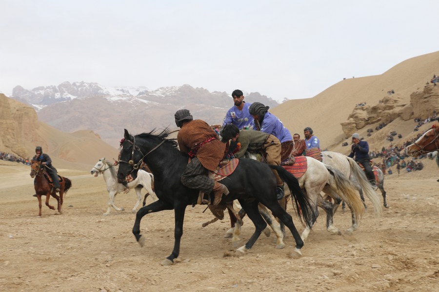 BAMYAN, Afghanistan, Feb. 21 (Xinhua) -- Afghan horse riders galloped over sand fields in Bamiyan province and competed for a goat during Buzkashi, the country's much-beloved "goat grabbing" game.