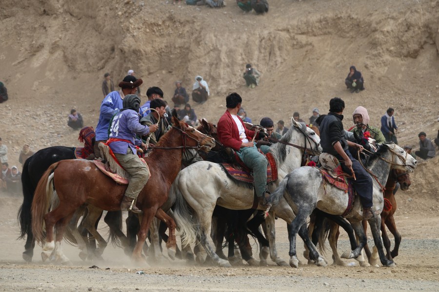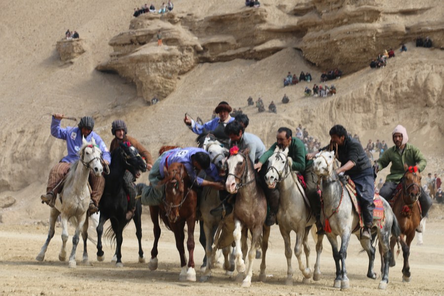 Afghan horse riders compete for a goat in a Buzkashi game in Bamyan province, Afghanistan on Feb. 19, 2023. (Photo by Ziaodin Azad/Xinhua)