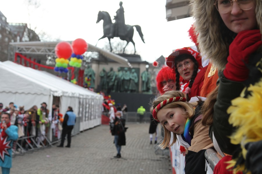 Revelers watch the Rose Monday carnival parade in Cologne, Germany, Feb. 20, 2023. (Xinhua/Shan Weiyi)■