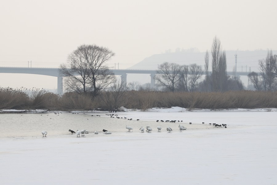 This photo taken on Feb. 17, 2023 shows whooper swans (white-feathered) and other wintering birds at a habitat near the Yellow River in Lanzhou, northwest China's Gansu Province. (Xinhua)