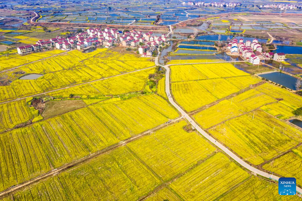 Cole flower fields are seen in Guanhu Village, Zhangshu City of east China's Jiangxi Province, Feb. 21, 2023. (Photo by Zhou Liang/Xinhua)