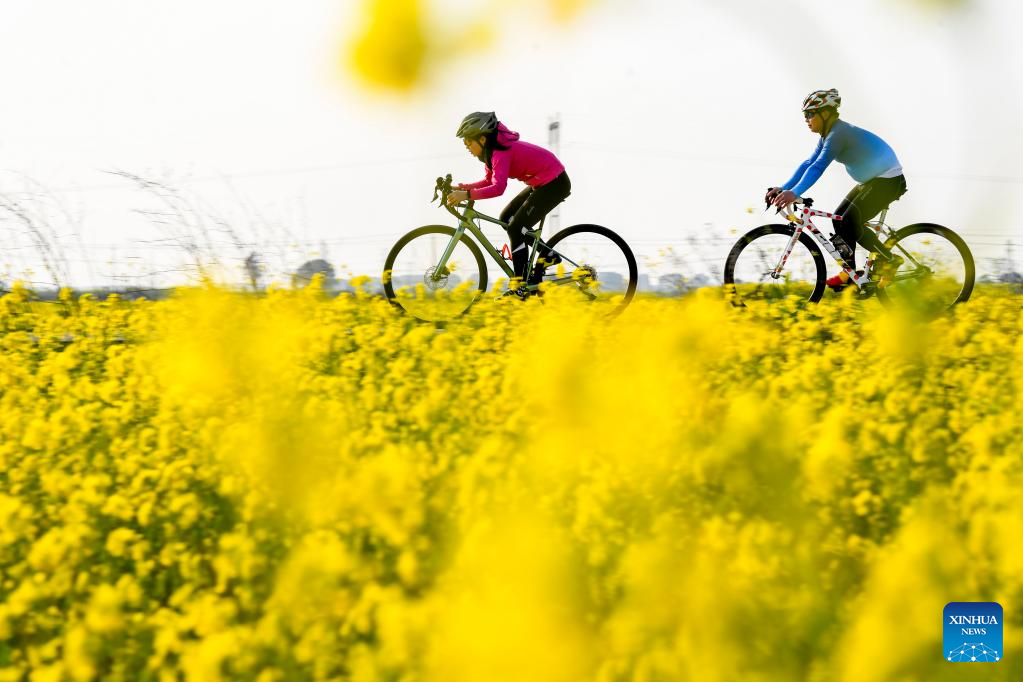 People ride near a cole flower field in Guanhu Village, Zhangshu City of east China's Jiangxi Province, Feb. 21, 2023. (Photo by Zhou Liang/Xinhua)