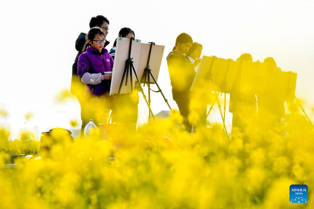 Students draw pictures near a cole flower field in Guanhu Village, Zhangshu City of east China's Jiangxi Province, Feb. 21, 2023. (Photo by Zhou Liang/Xinhua)