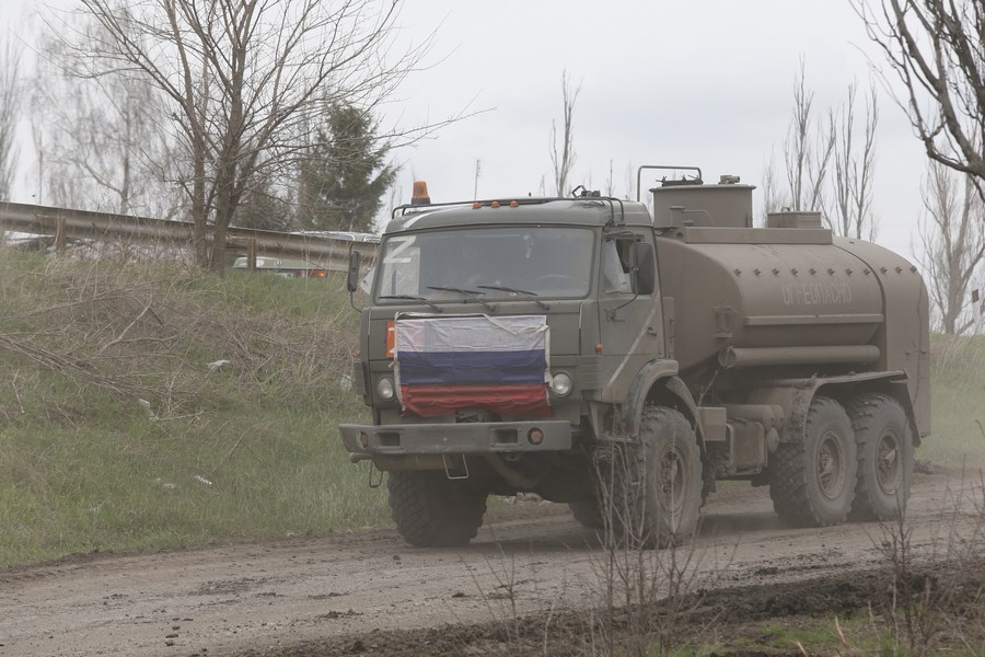 An army vehicle runs on a road near Mariupol on April 17, 2022. (Photo by Victor/Xinhua)