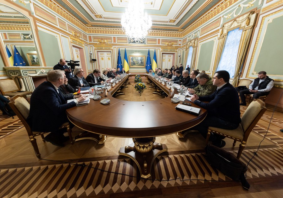 The photo shows the 24th Ukraine-EU summit is held in Kiev, Ukraine, Feb. 3, 2023. (Ukrainian presidential office/Handout via Xinhua)