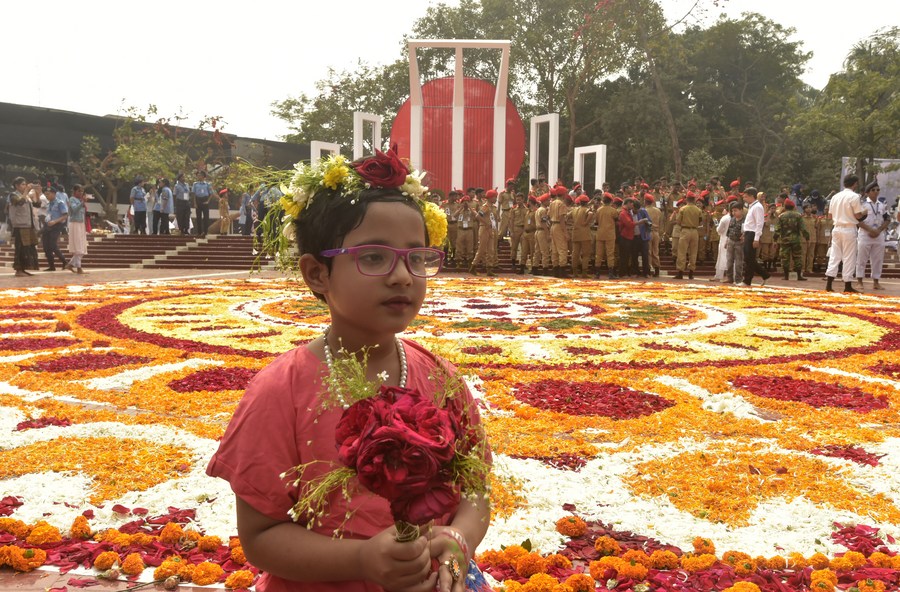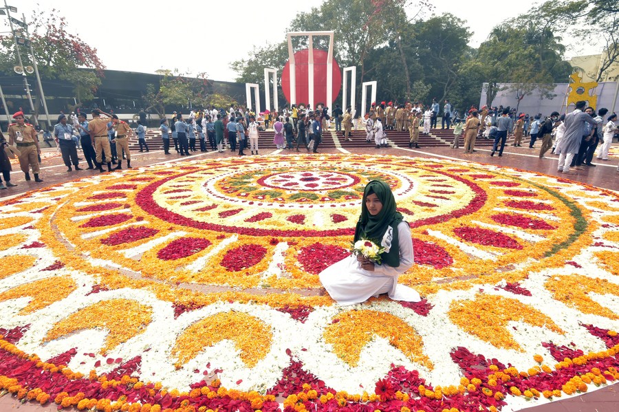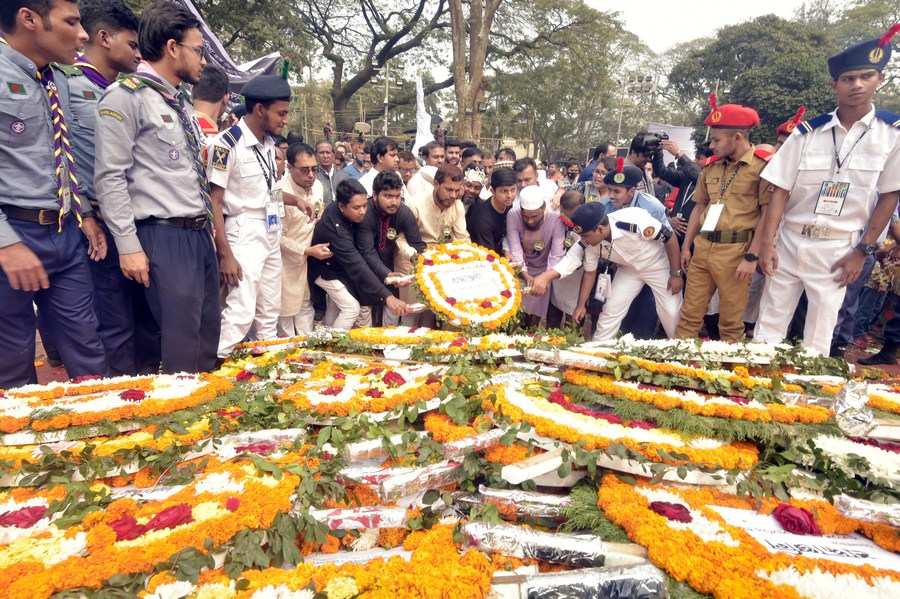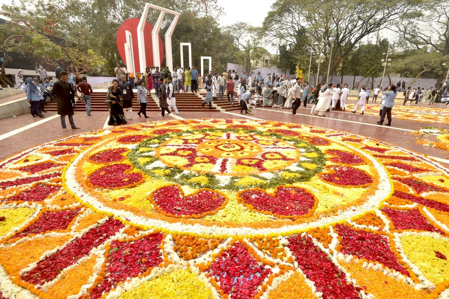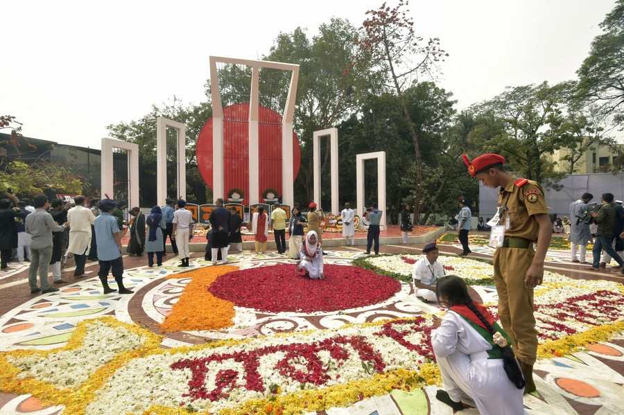 DHAKA, Feb. 22 (Xinhua) -- Hundreds of thousands of people went to the Central Shaheed Minar, a solemn and iconic monument, in Dhaka, Bangladesh to pay tributes to the country's language movement activists who sacrificed their lives on Feb. 21, 1952, which was declared to be the International Mother Language Day by the UNESCO in 1999.
