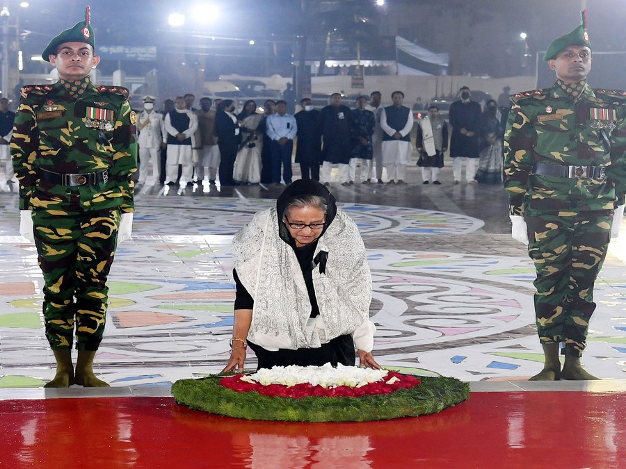 Bangladeshi Prime Minister Sheikh Hasina pays tributes to the country's language movement heroes at the altar of the Central Shaheed Minar, a solemn and iconic monument, in Dhaka, Bangladesh on Feb. 21, 2023. (PID/Handout via Xinhua)
