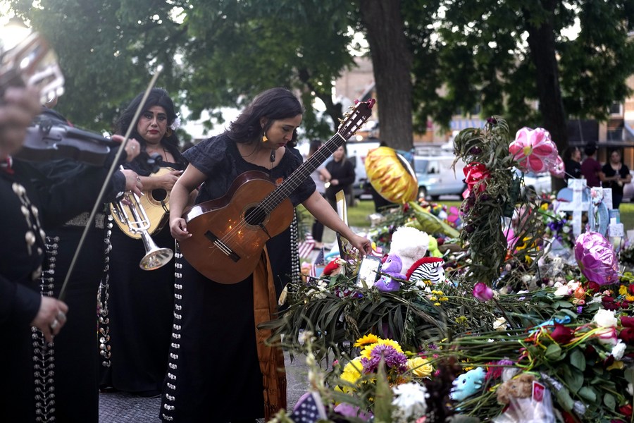 People mourn for victims of a school mass shooting at Town Square in Uvalde, Texas, the United States, May 30, 2022. (Xinhua/Wu Xiaoling)