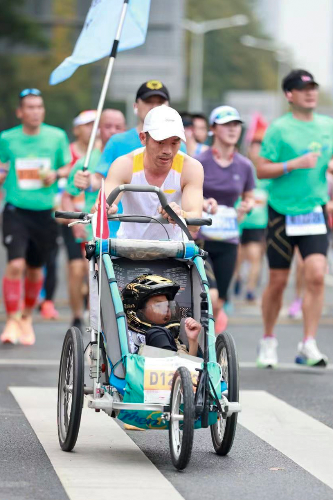 Other runners near Xiaobai showed kindness and positive energy around their stroller, cheering them on as they passed.