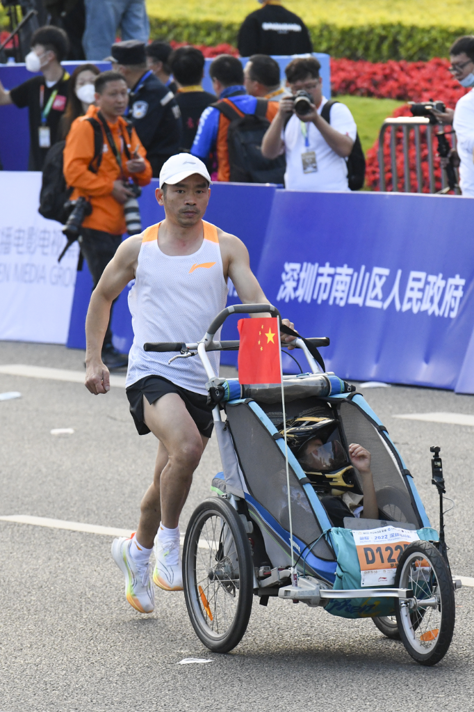 Luo Shujian runs the 2023 Shenzhen Marathon with Xiaobai in the stroller. (Photo courtesy of the organizing committee)