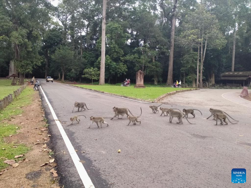The Apsara National Authority (ANA), which is responsible for managing, safeguarding and preserving the Angkor site, said in a news release that the number of monkeys at the ancient park had increased significantly with the transition of natural life from wild monkeys to domestic monkeys. (ANA/Handout via Xinhua)