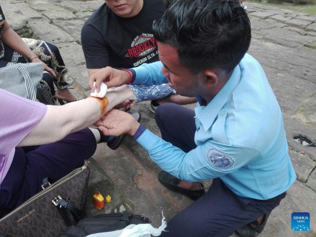 This undated photo shows a staff member treating the wound for a tourist bitten by a monkey at the Angkor Archeological Park in Siem Reap province, Cambodia. Throngs of monkeys living in Cambodia's famed Angkor Archeological Park are posing a risk to tourists and temples, a Cambodian government agency said on Wednesday. The Apsara National Authority (ANA), which is responsible for managing, safeguarding and preserving the Angkor site, said in a news release that the number of monkeys at the ancient park had increased significantly with the transition of natural life from wild monkeys to domestic monkeys. (ANA/Handout via Xinhua)