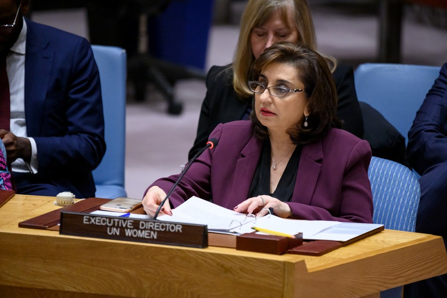 UN Women Executive Director Sima Bahous (Front) speaks during a Security Council meeting at the UN headquarters in New York, on Feb. 22, 2023. (Loey Felipe/UN Photo/Handout via Xinhua)