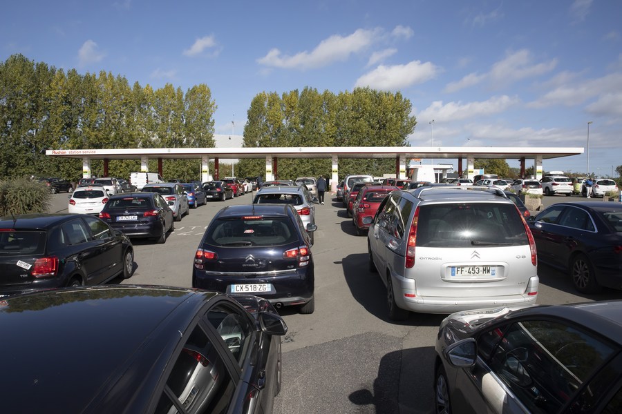 Cars line up for fuel outside a gas station in Lille, north France, Oct. 6, 2022. (Photo by Sebastien Courdji/Xinhua)