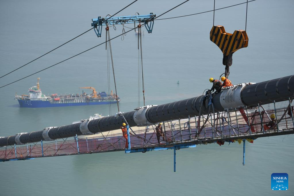 Workers work at the construction site of Lingdingyang bridge in south China's Guangdong Province, Feb. 22, 2023.