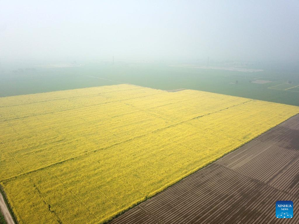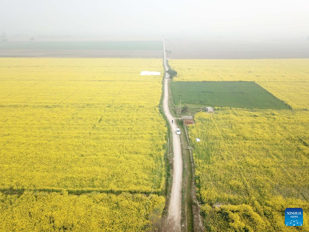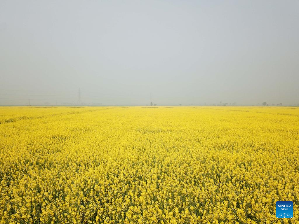 This aerial photo taken on Feb. 20, 2023 shows blooming canola field on the outskirts of Gujranwala district in Pakistan's Punjab province. To help the country meet its edible oil demand and support its foreign exchange reserves, Chinese company Wuhan Qingfa Hesheng and a Pakistani company Evyol group jointly provide high-quality hybrid seeds to Pakistani farmers.(Xinhua/Ahmad Kamal)