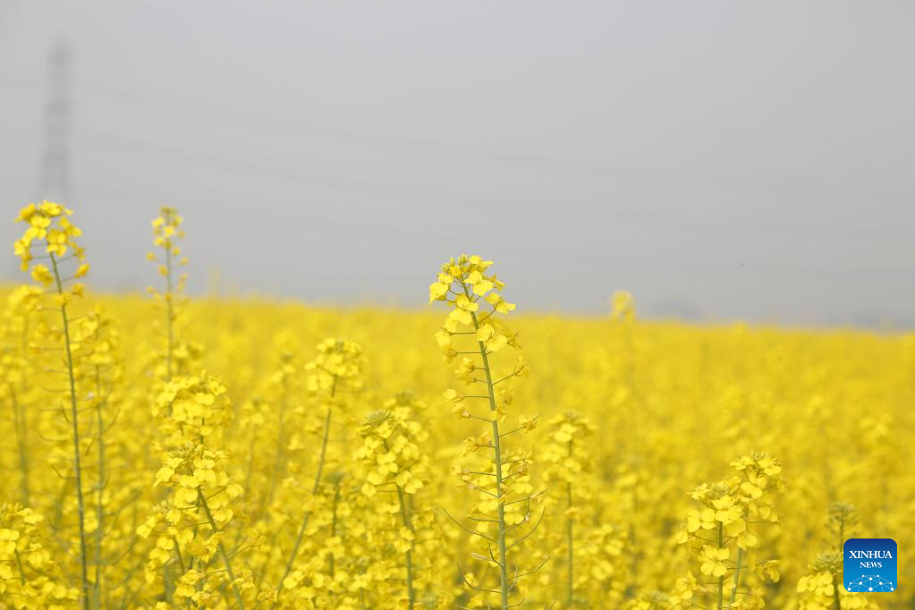 This photo taken on Feb. 20, 2023 shows blooming canola field on the outskirts of Gujranwala district in Pakistan's Punjab province. To help the country meet its edible oil demand and support its foreign exchange reserves, Chinese company Wuhan Qingfa Hesheng and a Pakistani company Evyol group jointly provide high-quality hybrid seeds to Pakistani farmers.(Xinhua/Ahmad Kamal)
