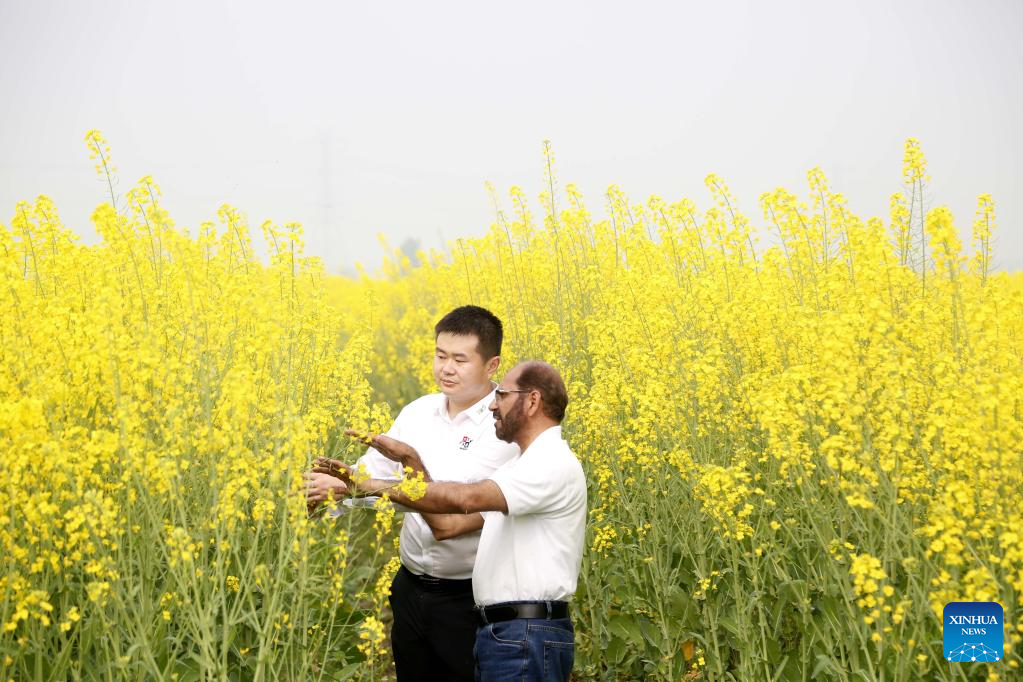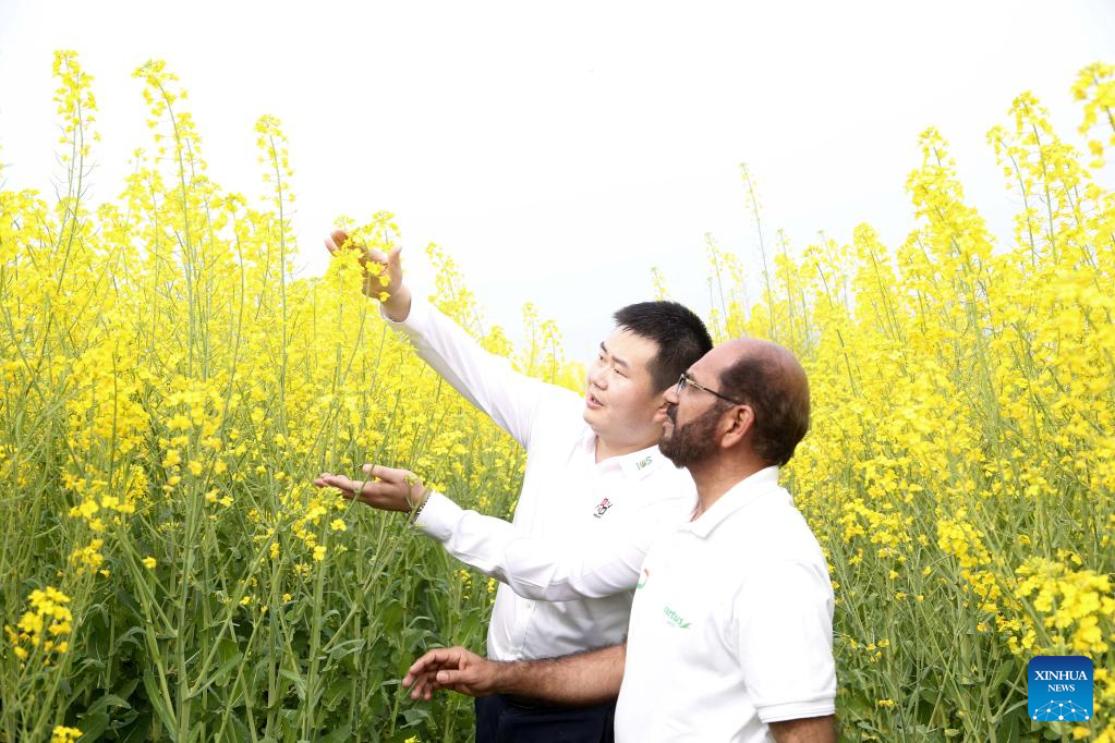 Zhou Xusheng (L), director of the international business department of Wuhan Qingfa Hesheng Seed company, works with a seed expert from Pakistani company Evyol group in canola field on the outskirts of Gujranwala district in Pakistan's Punjab province on Feb. 20, 2023. To help the country meet its edible oil demand and support its foreign exchange reserves, Chinese company Wuhan Qingfa Hesheng and a Pakistani company Evyol group jointly provide high-quality hybrid seeds to Pakistani farmers.(Xinhua/Ahmad Kamal)