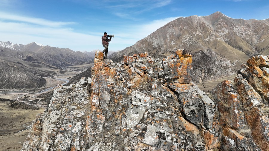 This aerial photo shows Gecho Chopee taking photos while patrolling at the Angsai Canyon in Angsai Township of Zaduo County, Yushu Tibetan Autonomous Prefecture, northwest China's Qinghai Province, Feb. 22, 2023. (Xinhua/Zhang Hongxiang)■