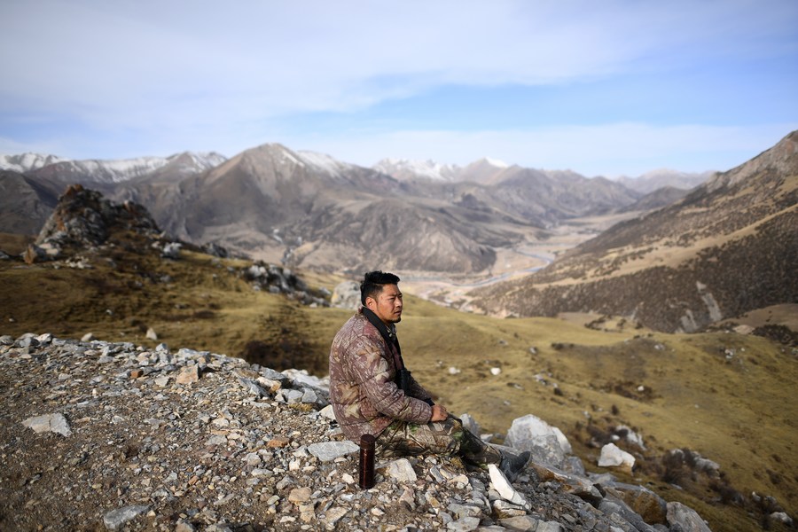 Gecho Chopee takes a rest while patrolling at the Angsai Canyon in Angsai Township of Zaduo County, Yushu Tibetan Autonomous Prefecture, northwest China's Qinghai Province, Feb. 22, 2023. (Xinhua/Zhang Hongxiang)