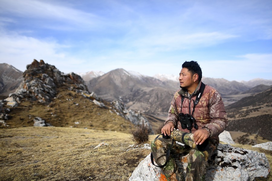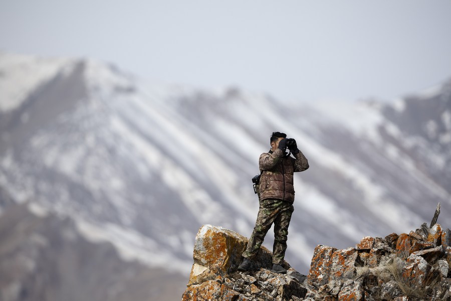 Gecho Chopee patrols at the Angsai Canyon in Angsai Township of Zaduo County, Yushu Tibetan Autonomous Prefecture, northwest China's Qinghai Province, Feb. 22, 2023. (Xinhua/Fei Maohua)
