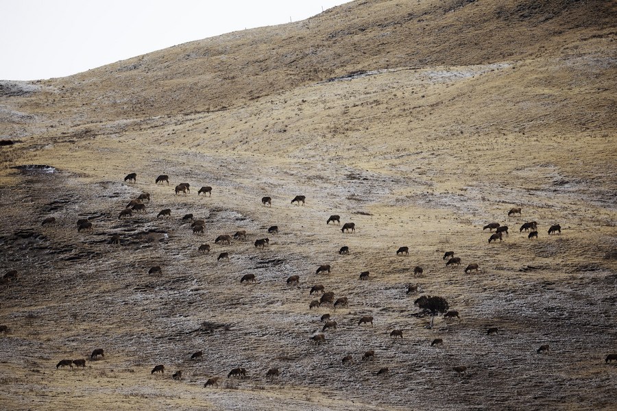 This photo taken on Feb. 22, 2023 shows a group of white-lipped deer at Angsai Canyon in Angsai Township of Zaduo County, Yushu Tibetan Autonomous Prefecture, northwest China's Qinghai Province. (Xinhua/Fei Maohua)